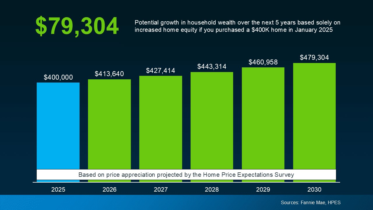 Let’s put real numbers into this equation, because it adds up quickly. Based on those expert projections, if you bought a typical $400,000 home in 2025, it could gain nearly $80,000 in value by 2030 (see graph below):