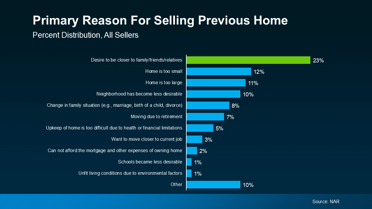 Living near family and friends is a universal motivator that cuts across all types of buyers, whether you’re buying your first home or making a big lifestyle change.